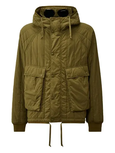 olive green quilted design signature goggle hood snap button fastening front patch pockets raglan sleeves C.P. Company suggests removing any detachable accessories before washing.