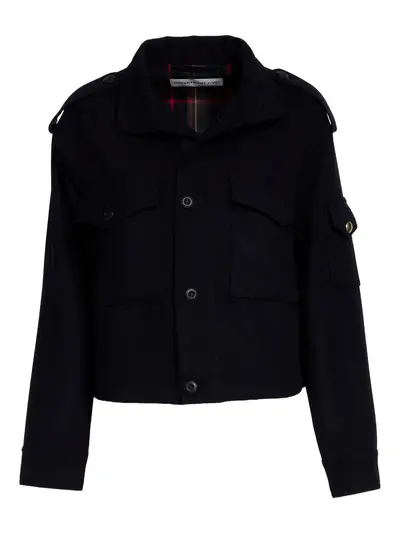 navy blue button fastening two front flap pockets shoulder yoke buttoned cuffs drawstring hem
