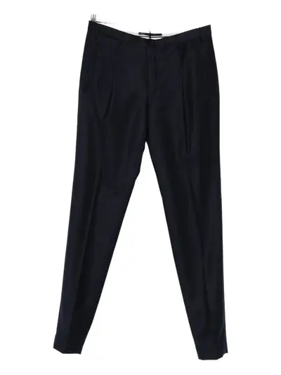 dark blue virgin wool pleat detailing side slit pockets belt loops concealed fastening
