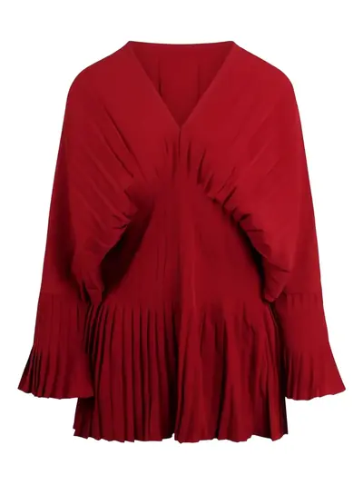 red V-neck pleated design long sleeves flared cuffs