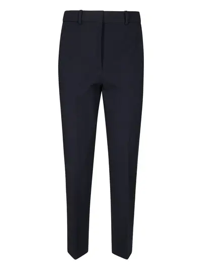 navy blue concealed front button, hook and zip fastening two side slash pockets two rear welt pockets