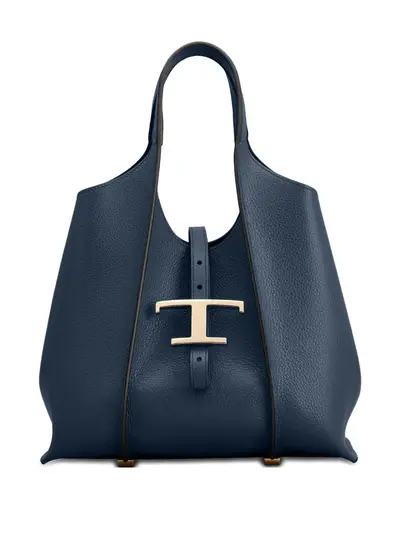 dark blue leather two top handles foldover strap with buckle fastening internal zip-fastening pocket