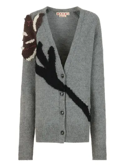 grey V-neck front button fastening floral appliqué long sleeves