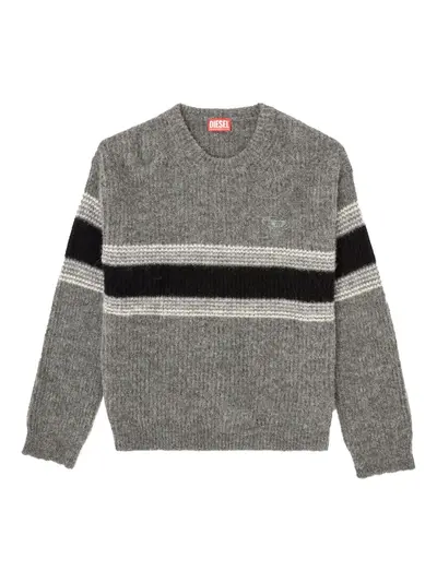 grey striped embroidered logo rib knit round neck long sleeves