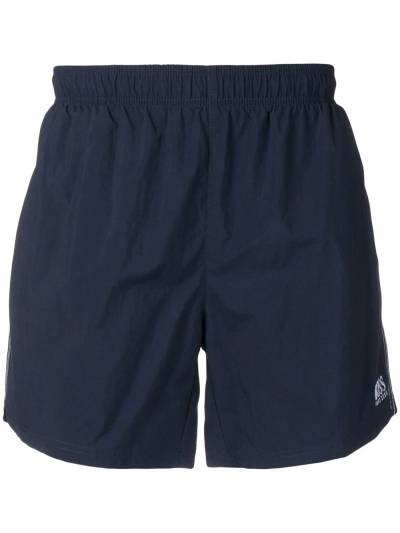 Blue logo print swim shorts from BOSS featuring a mid rise, an elasticated waistband, a stripe detail to the side and side pockets. Swimwear must be tried on over your own garments.
