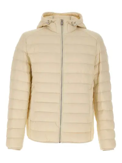 beige horizontal quilting drawstring hood zip fastening side pockets logo on the sleeve