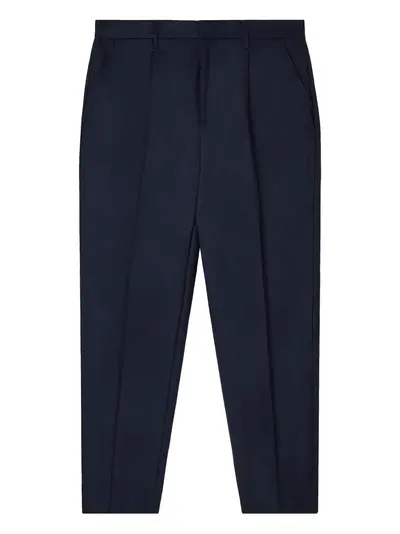 navy blue belt loops side pockets back welt pockets logo plaque zip and hook closure