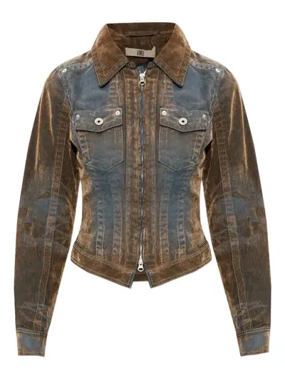 brown point collar front zip fastening buttoned flap pockets long sleeves buttoned cuffs