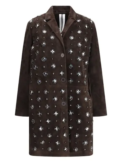 brown stone embellishments notched lapel button closure long sleeves structured design