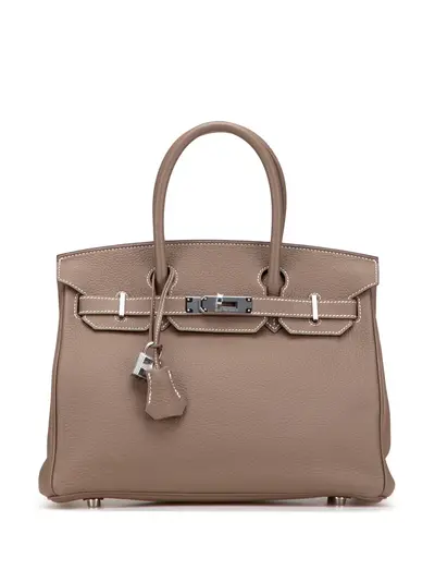 This Birkin 30 features a Togo leather body in Etoupe color, rolled leather handles, a front flap with a metal turn lock closure, and interior zip and slip pockets. Brown. Serial Number: □Q. Inclusions: padlock, key, dust bag, charm. Condition: EXCELLENT. This previously owned item is in near-perfect condition with no signs of damage or use. Due to the exclusivity of this item and its limited availability, processing and delivery might take longer than usual. Please refer to the photos on this product page for a detailed view of the item, including any damages declared.