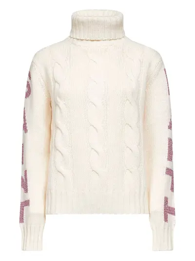 ivory cable-knit design jacquard lettering at sleeves ribbed turtleneck collar ribbed cuffs ribbed bottom band