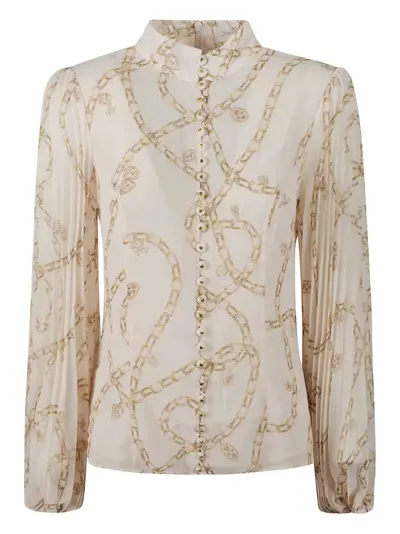 cream chain print button fastening pleated sleeves mock neck long sleeves