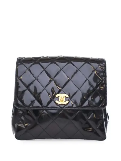 quilted patent leather body flat leather back straps front flap with CC turn lock closure three interior compartments interior zip pockets black Inclusions: authenticity card. Condition: GOOD. This previously owned and used item is in good condition with minimal signs of use. This may include fading of material or plating and scratches. Due to the exclusivity of this item and its limited availability, processing and delivery might take longer than usual. Please refer to the photos on this product page for a detailed view of the item, including any damages declared.