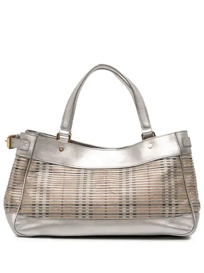 coated canvas body with leather trim flat leather straps open top with magnetic snap button closure interior zip compartment interior zip and slip pockets silver Serial Number: ITEFFEPI14SCA This item has no inclusions. Condition: GOOD. This previously owned and used item is in good condition with minimal signs of use. This may include fading of material or plating and scratches. Declared Damages: Handle/Strap Feature(s) Minor Loose Stitching. Front Feature(s) Minor Loose Stitching. Please refer to the photos on this product page for a detailed view of the item, including any damages declared.
