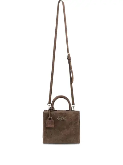 brown top handle detachable shoulder strap logo lettering tag detail