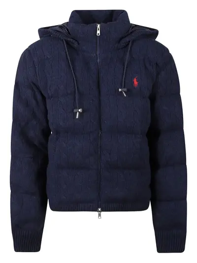 blue cable knit drawstring hood zip fastening embroidered logo padded design