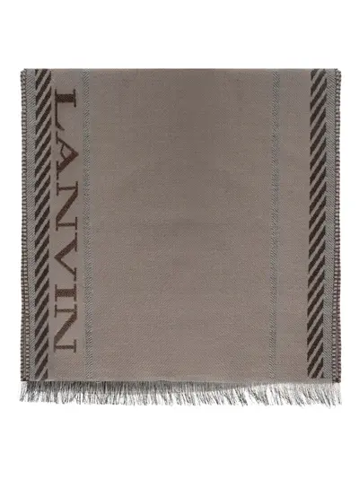 grey logo print striped trim fringed edge rectangular shape wool-silk blend