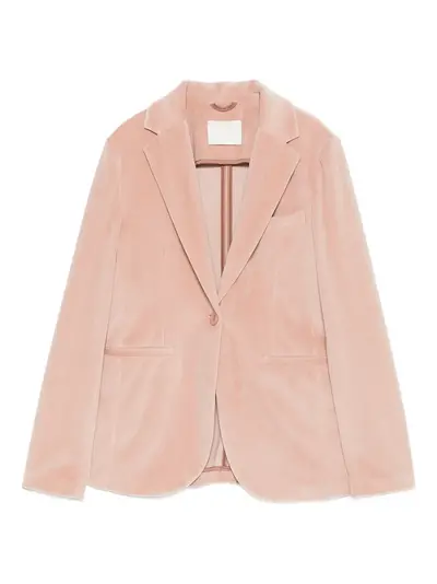 peony pink velvet effect notched lapels button fastening front flap pockets long sleeves