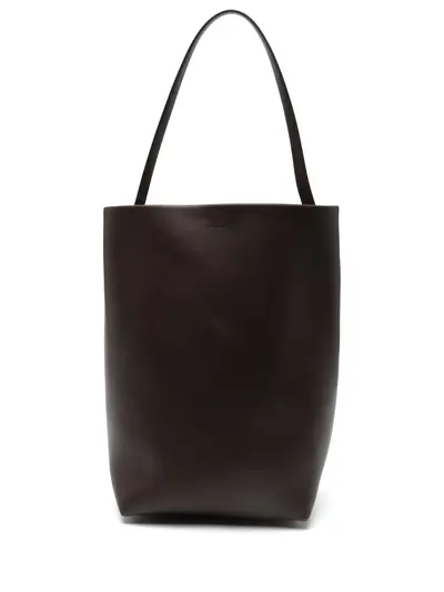 chocolate brown self-tie fastening two top handles embossed logo to the front This piece comes complete with a protective dust bag.