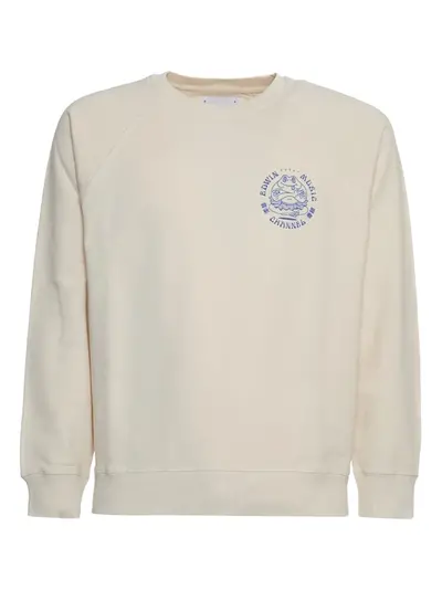 cream round neck long sleeves ribbed collar and cuffs ribbed hem print to the chest print to the back