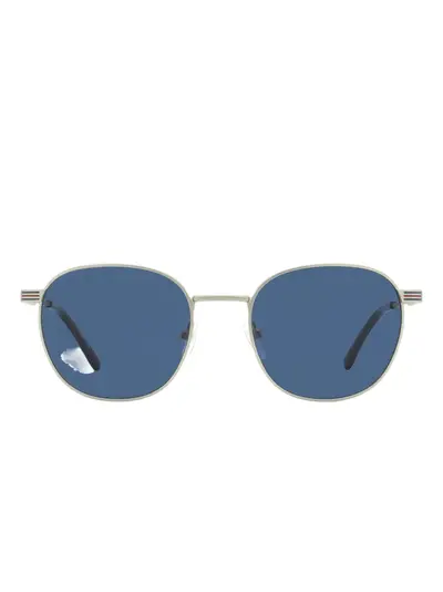 light grey oval frame striped detail logo detail acetate temple tips nose pads These glasses come with a protective case.