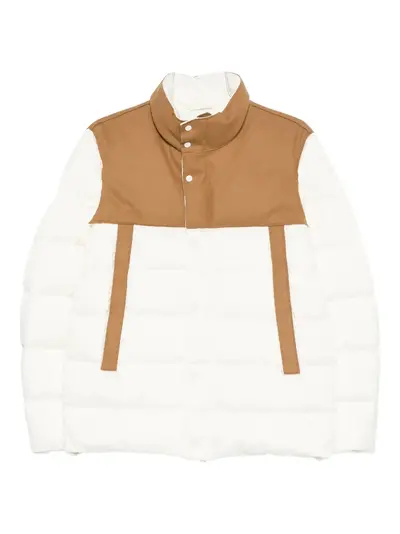 white/brown panelled design stand-up collar front press-stud fastening quilted