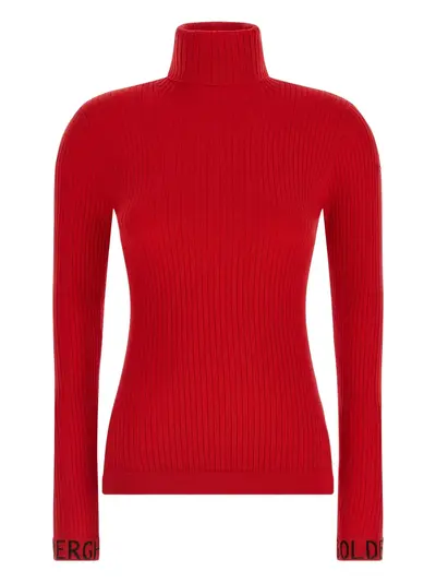red ribbed knit high neck long sleeves logo intarsia metal tag appliqué