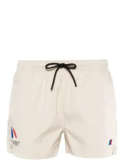 light beige stretch-design logo print to the front rubberised logo detail two diagonal pockets to the sides rear welt pocket short side slits elasticated drawstring waistband thigh-length mesh lining Be mindful to try on swimwear over your own garments.