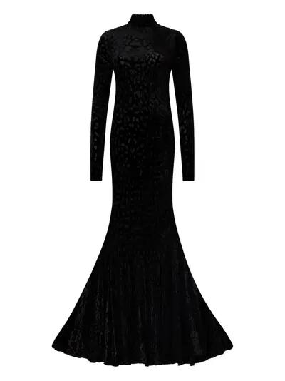 black jaguar skin motif high collar long sleeves flared hem invisible back zip closure