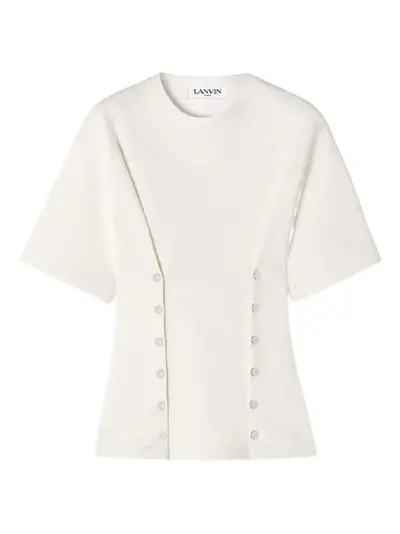 pearl short sleeves fitted bodice round neck button embellishment natural cotton