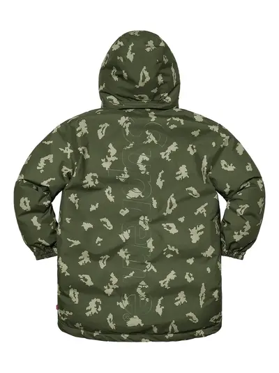 green camouflage fur trim hood long sleeves concealed fastening straight hem