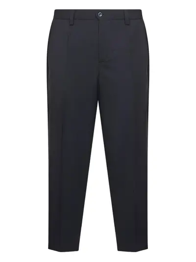 blue belt loops elasticated back waistband side pockets back buttoned welt pockets pressed leg creases