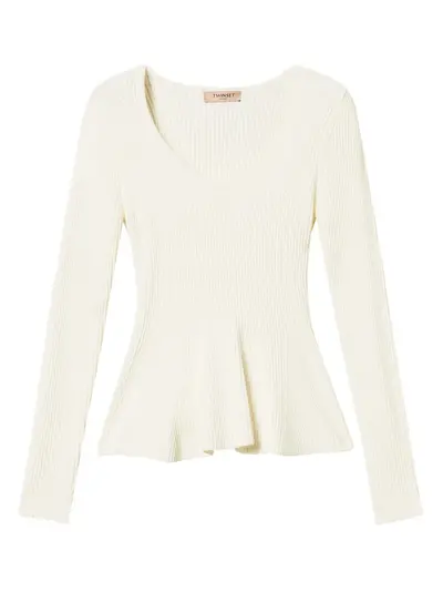 white ribbed knit v-neck long sleeves peplum hem