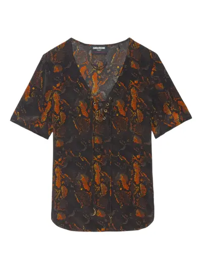 black and multicolour python print v-neck lace-up detail short sleeves