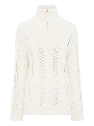 ivory cable knit mock neck half zip fastening open knit details long sleeves