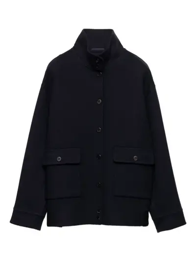 blue stand-up collar buttoned cuffs front button closure patch pockets reversible