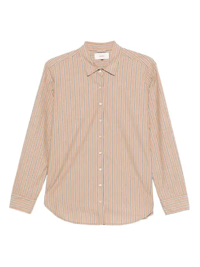 beige vertical stripe pattern front button closure long sleeves buttoned cuffs classic collar