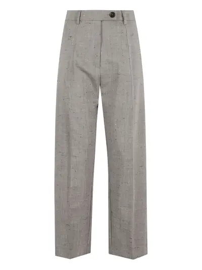 grey wool front button and zip fastening belt loops side slit pockets rear welt pockets