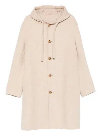 light beige wool-cashmere blend drawstring hood front button fastening long sleeves straight hem