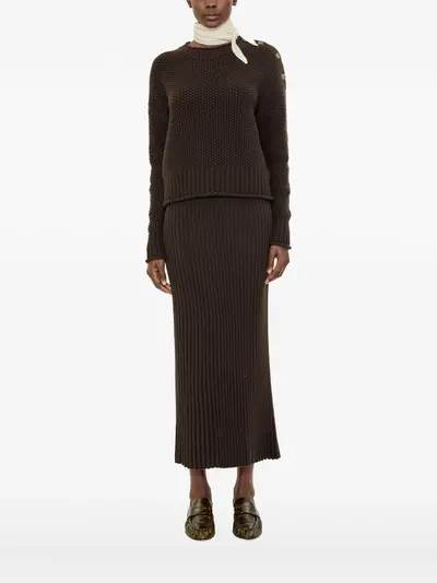 brown cashmere textured knit button embellishment ribbed detail round neck long sleeves