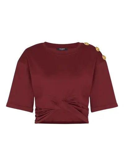 burgundy twisted front short sleeves crew neck button embellishment cotton