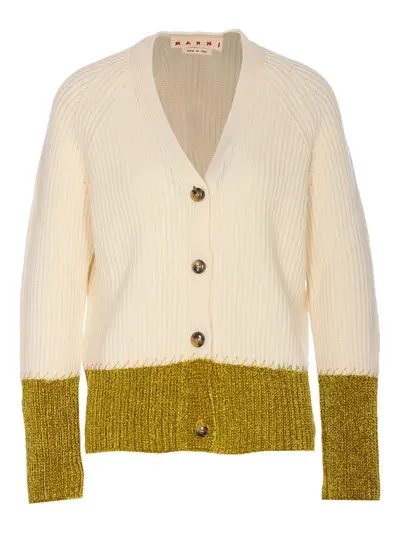 light beige and green ribbed knit front button fastening V-neck long sleeves contrast panel