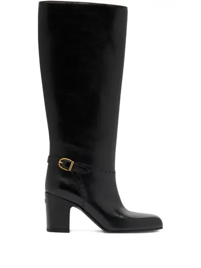 black calf leather buckle-fastening strap block heel gold-tone hardware perforated detailing