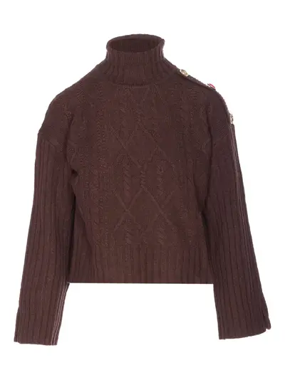 brown crew neck long sleeves crystal application ribbed knit
