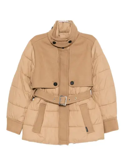 light brown front button and zip fastening two side welt pockets buttoned-cuff sleeves detachable adjustable waist strap