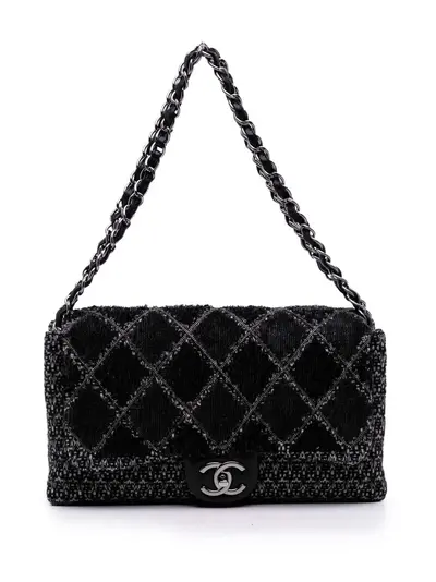tweed and sequin body leather woven chain shoulder strap front flap with turn lock closure exterior back slip pocket three interior compartments interior zip pocket black Serial Number: 13905292 This item has no inclusions. Condition: EXCELLENT. This previously owned item is in near-perfect condition with no signs of damage or use. Declared Damages: Exterior Back Feature(s) Minor Loose Stitching. Please refer to the photos on this product page for a detailed view of the item, including any damages declared.