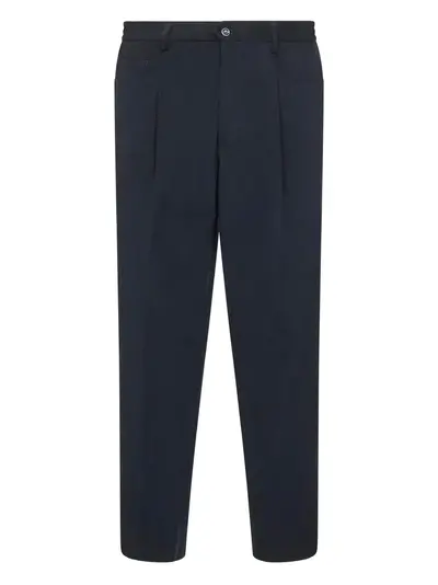 blue belt loops elasticated waistline five-pocket design front pleat buttoned back pockets