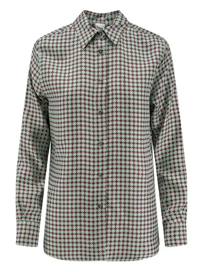 green and brown geometric pattern front button fastening long sleeves buttoned cuffs classic collar