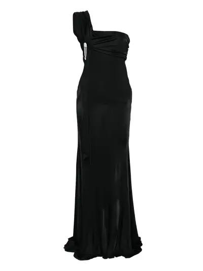 black one-shoulder design knot detail pin embellishment draped detail floor-length