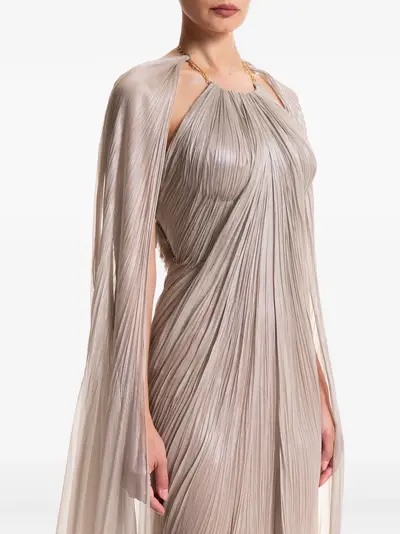 beige pleated bodice cape sleeves halter neck lace-up back chain detail